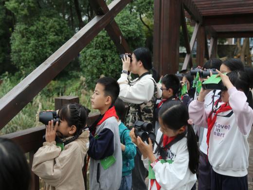 第五站:户外观鸟 最后一个环节是三方联盟特为孩子们增加的观鸟学习环节,使用望远镜观察野生鸟类。在自然老师指导下,学生们学会了如何正确操作设备,并安静有序地寻找目标物种。这不仅增加了他们对当地生态环境的认识,也为今后继续探索打下了良好基础。